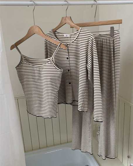 程よいフィット感とサラッとした着心地です。薄めの素材+キャミソール付きの3点セットなので、春夏にピッタリなパジャマだと思います。